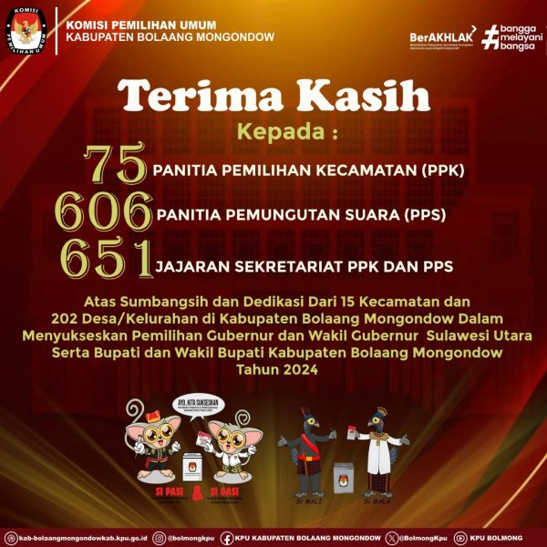 Segenap jajaran KPU Kabupaten Bolaang Mongondow mengucapkan terima kasih yang sebesar-besarnya atas sumbangsih dan dedikasi seluruh Badan Adhoc se- Kabupaten Bolaang Mongondow dalam menyukseskan Pemilihan Gubernur dan Wakil Gubernur Provinsi Sulawesi Utara serta Bupati dan Wakil Bupati Kabupaten Bolaang Mongondow Tahun 2024
