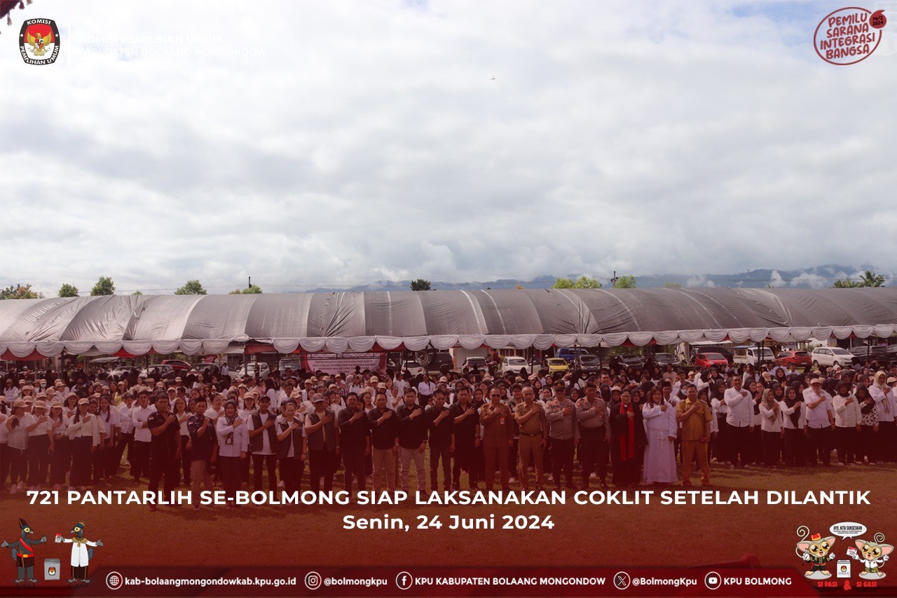 Lolak, kab-bolaangmongondow.kpu.go.id - Sebanyak 721 Pantarlih resmi dilantik oleh Ketua Komisi Pemilihan Umum (KPU) Kabupaten Bolaang Mongondow (Bolmong), Afif Zuhri di Lapangan Desa Gumempang Desa Mopait, Kecamatan Lolayan.
