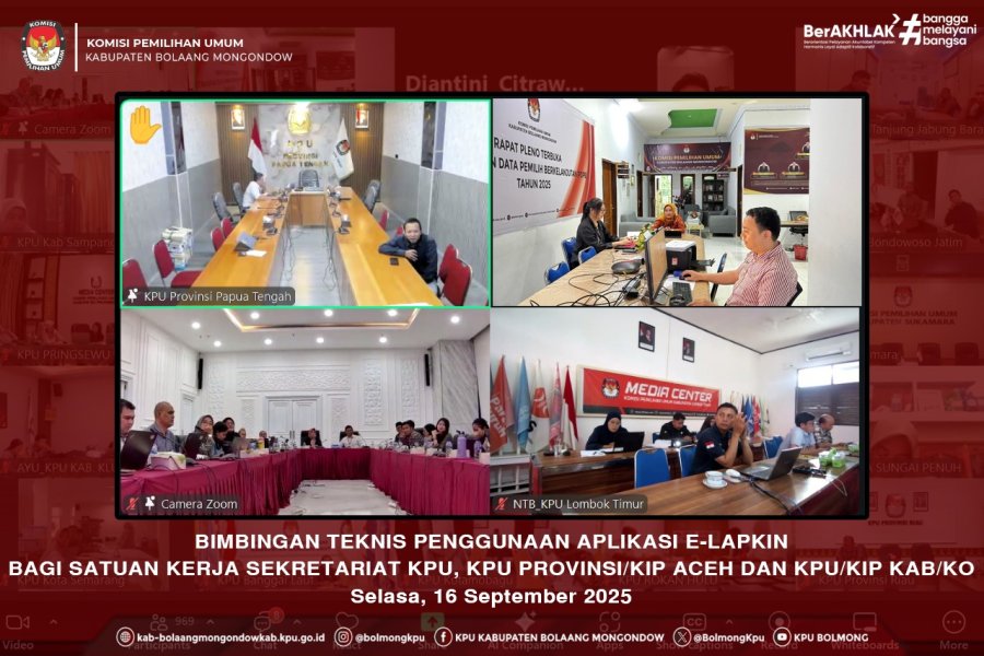 Lolak, kab-bolaangmongondow.kpu.go.id - KPU Kabupaten Bolaang Mongondow (Bolmong) mengikuti Bimbingan Teknis Penggunaan Aplikasi Pemantauan Tindak Lanjut Evaluasi SAKIP pada Aplikasi E-Lapkin bagi satuan kerja di Sekretariat Komisi Pemilihan Umum, Sekretariat Komisi Pemilihan Umum Provinsi, dan Sekretariat Komisi Pemilihan Umum Kabupaten/Kota yang dilaksanakan secara daring oleh KPU RI pada Selasa, 16 September 2025.