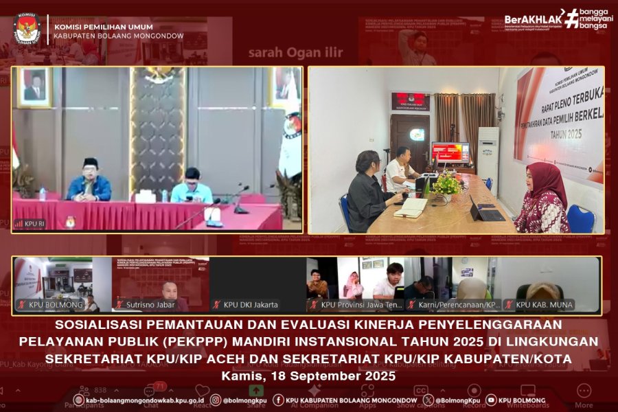 Lolak, kab-bolaangmongondow.kpu.go.id - KPU Kabupaten Bolaang Mongondow (Bolmong) mengikuti Sosialisasi Pemantauan dan Evaluasi Kinerja Penyelenggaraan Pelayanan Publik (PEKPPP) Mandiri Instansional Tahun 2025 di Lingkungan Sekretariat KPU/KIP Aceh dan Sekretariat KPU/KIP Kabupaten/Kota yang dilaksanakan secara daring oleh KPU RI pada Kamis, 18 September 2025.