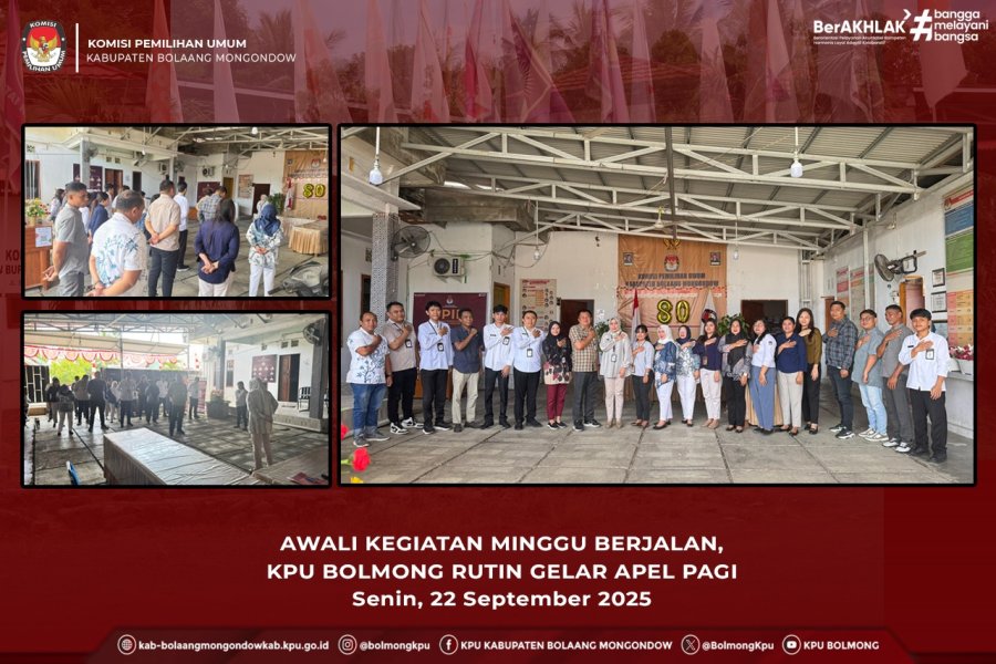 Lolak, kab-bolaangmongondow.kpu.go.id, Apel Pagi yang digelar setiap awal minggu berjalan bukan hanya sebagai rutinitas, tetapi juga merupakan cerminan kedisiplinan, tanggung jawab, dan keikhlasan kita terhadap pilihan hidup sebagai ASN, serta juga sebagai bentuk kesiapan personil dalam melaksanakan tugas sehari-hari. Hal ini ditegaskan Sekretaris KPU Kabupaten Bolaang Mongondow (Bolmong) Ratuganesty Mokoginta dalam arahannya pada Apel Pagi Senin (22/9/2025).