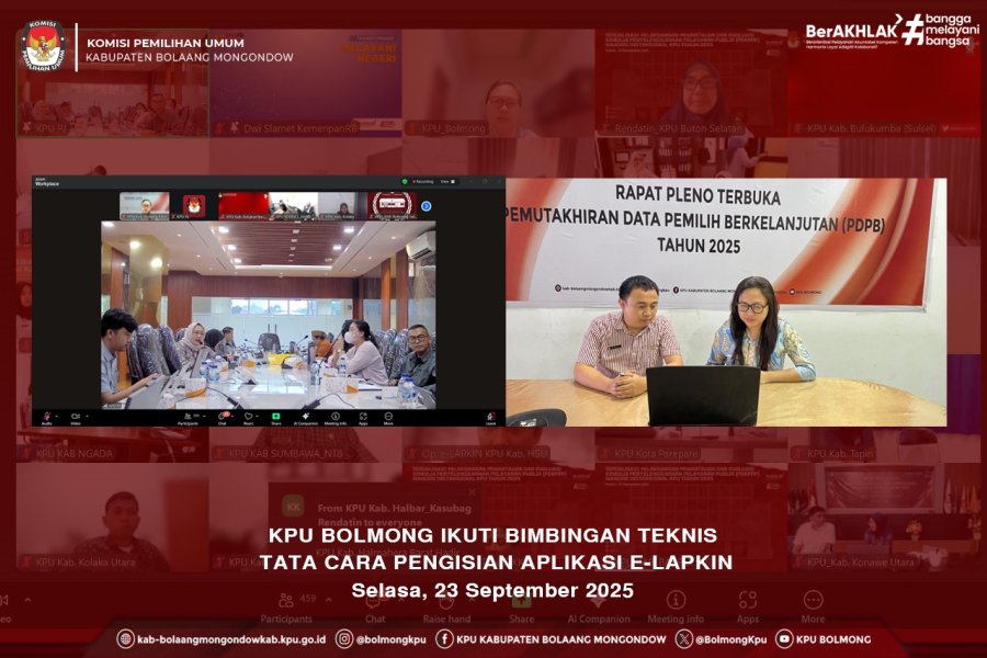 Lolak, kab-bolaangmongondow.kpu.go.id - KPU Kabupaten Bolaang Mongondow mengikuti Bimbingan Teknis Tata Cara Penginputan E-Lapkin yang dilaksanakan secara daring melalui Zoom Meeting oleh KPU RI pada Selasa, 23 September 2025. Kegiatan ini dilaksanakan sebagai tindak lanjut Sosialisasi Aplikasi E-Lapkin kepada seluruh Unit Kerja Eselon II KPU, KPU Provinsi/KIP Aceh dan KPU/KIP Kabupaten Kota di seluruh Indonesia pada hari Senin tanggal 15 September 2025.