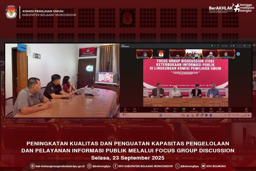 Lolak, kab-bolaangmongondow.kpu.go.id, dalam rangka Peningkatan Kualitas Dan Penguatan Kapasitas Pengelolaan dan Pelayanan Informasi Publik di Lingkungan KPU, KPU Provinsi/KIP Aceh dan KPU/KIP Kabupaten/Kota, KPU Kabupaten Bolaang Mongondow mengikuti kegiatan Focus Group Discussion (FGD) Keterbukaan Informasi Publik yang digelar KPU secara daring, Selasa (23/9/2025).