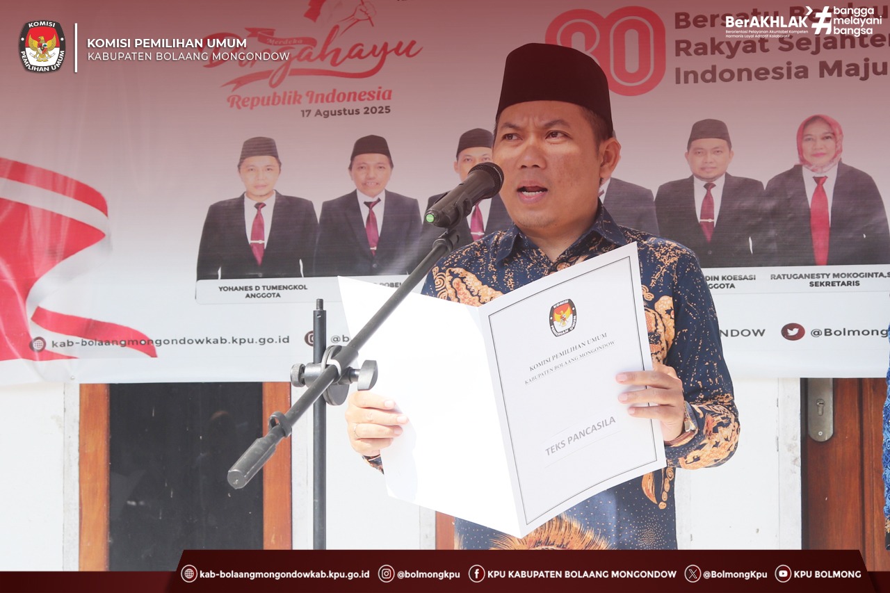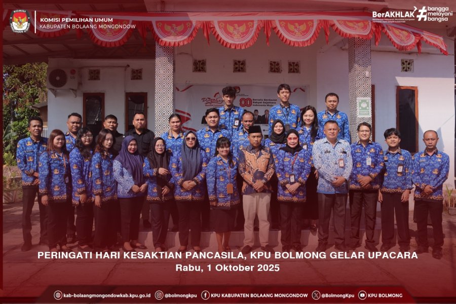 Lolak, kab-bolaangmongondow.kpu.go.id, Rabu (1/10/2025) KPU Kabupaten Bolaang Mongondow menggelar Upacara Peringatan Hari Kesaktian Pancasila dengan tema “Pancasila Perekat Bangsa Menuju Indonesia Raya”. Bertindak sebagai Inspektur Upacara, Ketua KPU Bolmong, Afif Zuhri.