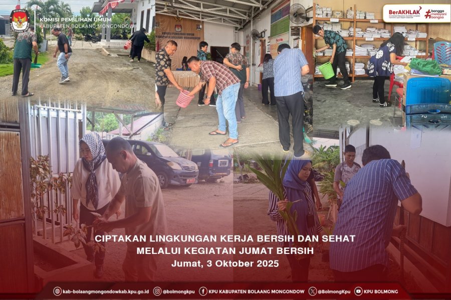 Lolak, kab-bolaangmongondow.kpu.go.id, Lingkungan kerja yang bersih dan sehat memberikan banyak manfaat, termasuk peningkatan kesehatan dan kesejahteraan pegawai, peningkatan produktivitas, serta penciptaan budaya kerja yang positif dan profesional. Hal inilah yang mandasari KPU Kabupaten Bolaang Mongondow secara rutin melaksanakan kegiatan Jumat Bersih sekali dalam seminggu.