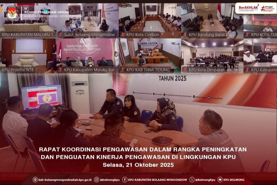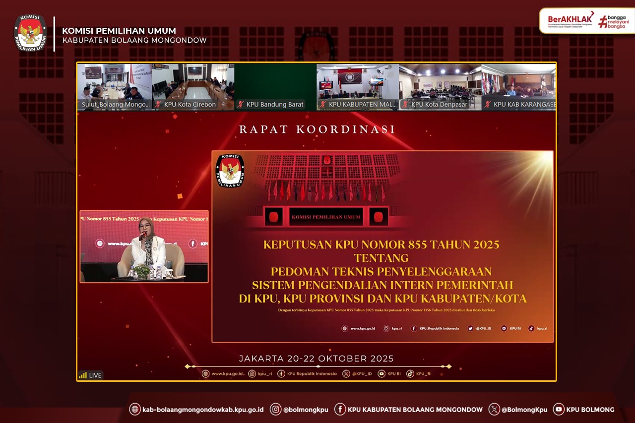 Lolak, kab-bolaangmongondow.kpu.go.id, Selasa (21/10/2025) KPU Kabupaten Bolaang Mongondow (Bolmong) mengikuti sesi pemaparan materi dalam Rapat Koordinasi Pengawasan dalam Rangka Peningkatan dan Penguatan Kinerja Pengawasan di Lingkungan KPU melalui zoom meeting.