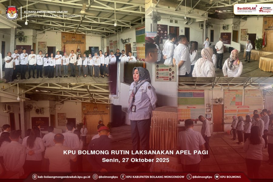 Lolak, kab-bolaangmongondow.kpu.go.id, Apel pagi yang dilaksanakan secara rutin oleh KPU Kabupaten Bolaang Mongondow memiliki manfaat bagi kelancaran pelaksanaan tugas dan fungsi pegawai. Selain sebagai sarana bagi pimpinan memberikan pembinaan, arahan dan melakukan pengawasan, juga untuk menyampaikan berbagai informasi pelaksanaan program dan kegiatan. Senin (27/10/2025) berkesempatan menjadi Pembina Apel, Sekretaris KPU Bolmong, Ratuganesty Mokoginta.