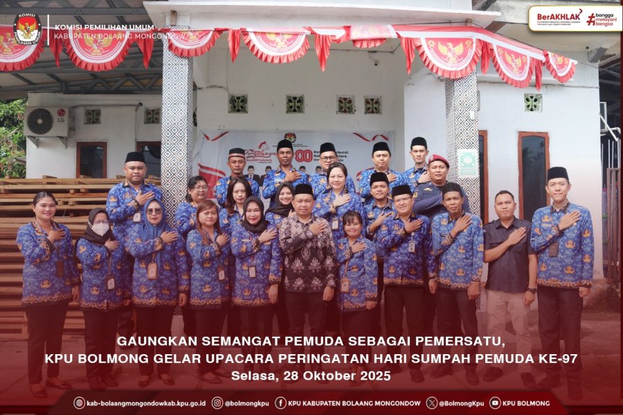 Lolak, kab-bolaangmongondow.kpu.go.id, Selasa (28/10/2025) KPU Kabupaten Bolaang Mongondow (Bolmong) menggelar Upacara Peringatan Hari Sumpah Pemuda dengan tema “Pemuda Pemudi Bergerak, Indonesia Bersatu”. Bertindak sebagai Pembina Upacara, Ketua Divisi Perencanaan, Data dan Informasi, Jalaludin Koesasi.