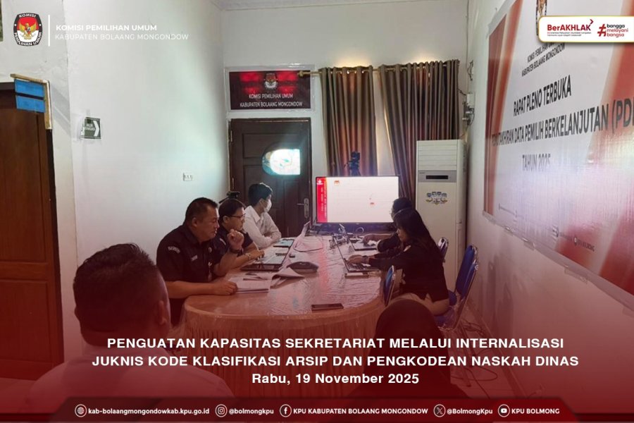 Lolak, kab-bolaangmongondow.kpu.go.id, Pada Rabu (19/11/2025) KPU Kabupaten Bolaang Mongondow (Bolmong) menggelar kegiatan Internalisasi PKPU Nomor 1257 Tahun 2024 tentang Kode Klasifikasi Arsip dan Pengkodean Naskah Dinas. Kegiatan ini diikuti oleh para Kepala Sub Bagian serta staf pelaksana di lingkungan Sekretariat KPU Kabupaten Bolaang Mongondow sebagai bagian dari peningkatan pemahaman terhadap dalam Tata Naskah Dinas dan Kode Arsip Naskah Dinas.