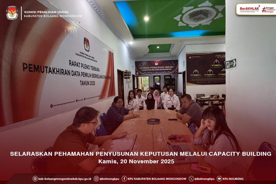 Lolak, kab-bolaangmongondow.kpu.go.id - Dalam rangka menyelaraskan praktik penyusunan keputusan sebagaimana diatur dalam Keputusan Komisi Pemilihan Umum Nomor 197 Tahun 2022 tentang Pedoman Teknis Penyusunan Keputusan di Lingkungan Komisi Pemilihan Umum, maka pada Kamis (20/11/2025) dilaksanakan Capacity Building Penyusunan Keputusan di Lingkungan KPU Kabupaten Bolaang Mongondow (Bolmong). Kegiatan ini dihadiri oleh para Kepala Sub Bagian dan Pelaksana/Fungsional pada masing-masing sub bagian.