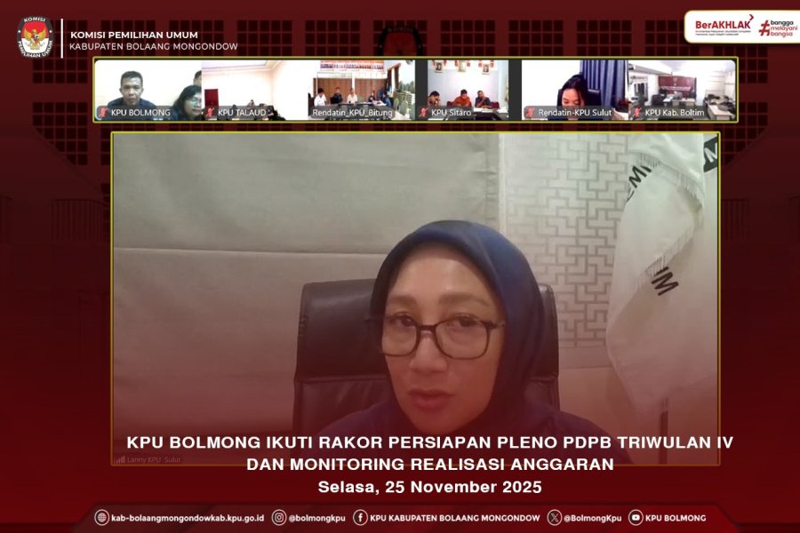 Bolmong, kab-bolaangmongondow.kpu.go.id – KPU Kabupaten Bolaang Mongondow (KPU Bolmong) mengikuti Rapat Koordinasi Persiapan Pelaksanaan Pleno PDPB Triwulan IV dan Monitoring Anggaran Pasca Revisi DIPA pada Selasa, (25/11/2025).