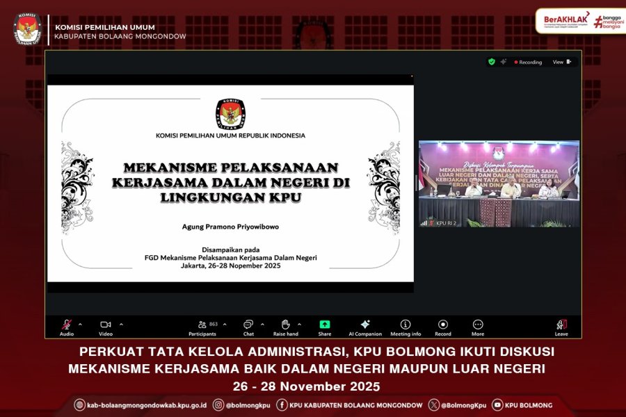 Bolmong, kab-bolaangmongondow.kpu.go.id – Komisi Pemilihan Umum (KPU) Kabupaten Bolaang Mongondow (Bolmong) turut serta dalam kegiatan Diskusi Kelompok Terpumpun (Focus Group Discussion) yang diselenggarakan oleh KPU Republik Indonesia. Kegiatan yang berlangsung selama tiga hari, mulai tanggal 26 hingga 28 November 2025 ini diikuti secara daring.