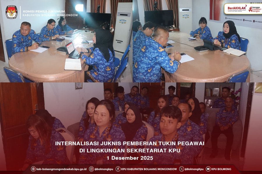 Bolaang Mongondow, kab-bolaangmongondow.kpu.go.id - KPU Kabupaten Bolaang Mongondow menggelar Rapat Internalisasi Petunjuk Teknis Pelaksanaan Pemberian Tunjangan Kinerja Pegawai pada Senin, 1 Desember 2025. Kegiatan ini dipimpin oleh Sekretaris KPU Kabupaten Bolaang Mongondow, Ratuganesty Mokoginta dan dihadiri oleh Para Kepala Sub Bagian (Kasubbag), dan Para Staf Pelaksana. Rapat ini dimaksudkan untuk menjadi wadah penyampaian aturan dan mekanisme terbaru terkait pemberian Tunjangan Kinerja di Lingkungan KPU Kab. Bolaang Mongondow.