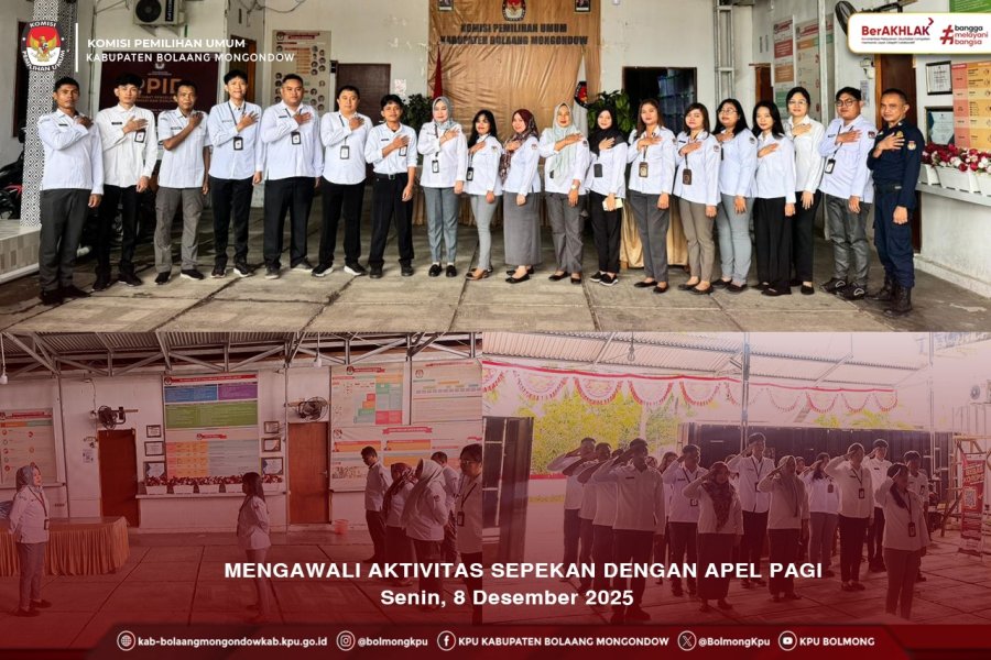 Bolmong, kab-bolaangmongondow.kpu.go.id – Mengawali aktivitas pekan ini, seluruh jajaran pegawai dan staf di lingkungan KPU Kabupaten Bolaang Mongondow melaksanakan kegiatan Apel Pagi.