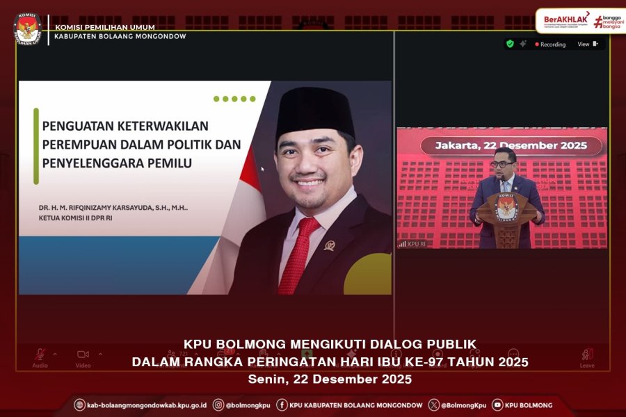 Bolmong, Kab-bolaangmongondow.kpu.id - KPU Kabupaten Bolaang Mongondow mengikuti Dialog Publik dalam rangka Peringatan Hari Ibu ke-97 Tahun 2025 dengan tema “Perempuan Penggerak Perubahan: Perempuan Memimpin, Demokrasi Berkembang” yang dilaksanakan secara daring oleh KPU RI pada Senin, 22 Desember 2025.