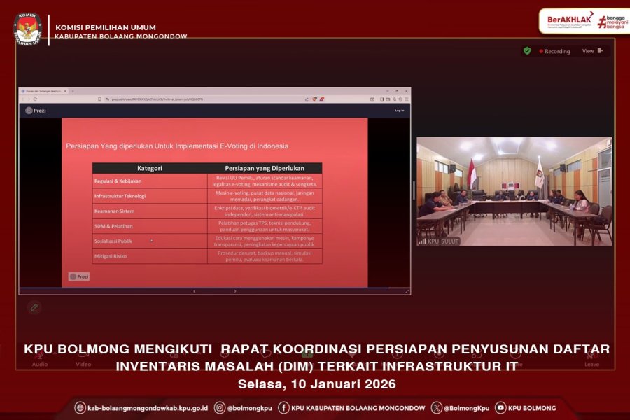 Bolmong, Kab-bolaangmongondow.kpu.id – KPU Bolmong mengikuti Rapat Koordinasi Persiapan Penyusunan Daftar Inventaris Masalah (DIM) terkait Infrastruktur IT dilaksanakan secara daring oleh KPU Provinsi Sulawesi Utara, Selasa (20/01/2026).