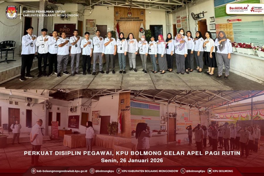 Bolmong, Kab-bolaangmongondow.kpu.id - Seluruh pegawai KPU Kabupaten Bolaang Mongondow kembali melaksanakan rutinitas apel pagi di lapangan utama pada Senin (26/01/2026). Kegiatan ini menjadi momentum penting untuk menyatukan visi dan meningkatkan koordinasi kerja sebelum memulai rangkaian tugas di pekan terakhir bulan Januari.