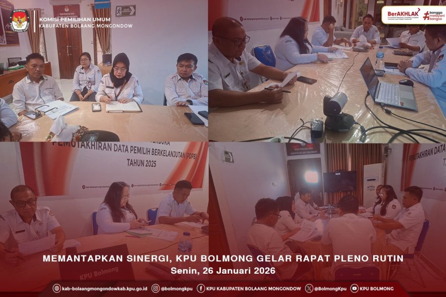 Bolmong, Kab-bolaangmongondow.kpu.id - Memasuki Minggu ke-IV bulan Januari Tahun 2026, Komisi Pemilihan Umum Kabupaten Bolaang Mongondow kembali menggelar Rapat Pleno Rutin guna memastikan seluruh kegitan berjalan dengan sesuai. Rapat dipimpin oleh Ketua KPU Bolmong, Afif Zuhri. Rapat dihadiri Anggota KPU, Sekretaris, para Kasubag, Bendahara serta notulen.