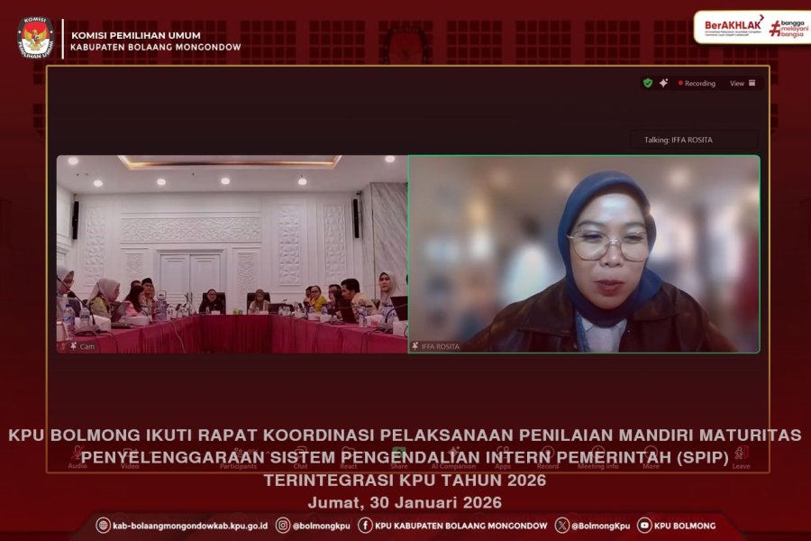 Bolmong, Kab-bolaangmongondow.kpu.id - Komisi Pemilihan Umum (KPU) Kabupaten Bolaang Mongondow (Bolmong) mengikuti Rapat Koordinasi (Rakor) Pelaksanaan Penilaian Mandiri Maturitas Penyelenggaraan Sistem Pengendalian Intern Pemerintah (SPIP) Terintegrasi KPU Tahun 2026, pada Jumat (30/1/2026).