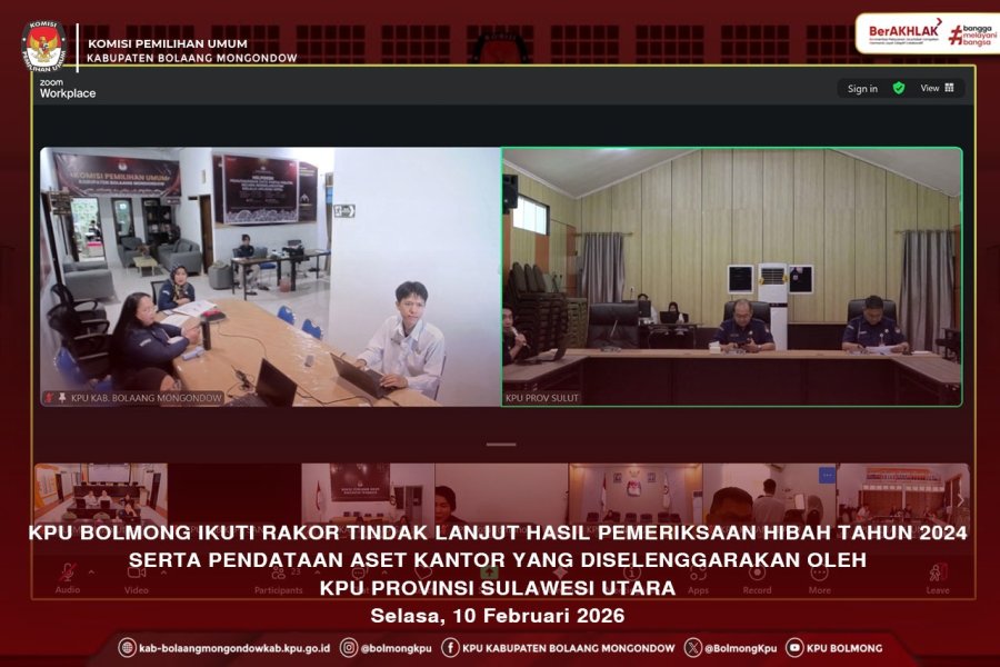 Bolmong, Kab-bolaangmongondow.kpu.id - KPU Bolaang Mongondow mengikuti Rapat Koordinasi Tindak Lanjut Hasil Pemeriksaan Hibah Tahun 2024 serta Pendataan Aset Kantor yang diselenggarakan oleh KPU Provinsi Sulawesi Utara. Kegiatan ini dilaksanakan secara daring melalui Zoom Meeting pada Selasa, 10 Februari 2026, dan diikuti oleh 15 KPU Kabupaten/Kota se-Sulawesi Utara.