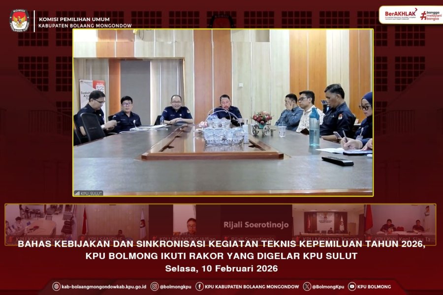 Bolmong, kab-bolaangmongondow.kpu.go.id - KPU Bolaang Mongondow (Bolmong) mengikuti Rapat Koordinasi Internalisasi Kebijakan dan Sinkronisasi Kegiatan Teknis Kepemiluan Tahun 2026, pada Selasa, 10 Februari 2026. Kegiatan ini diselenggarakan oleh KPU Provinsi Sulawesi Utara (Sulut) secara daring melalui Zoom diikuti oleh seluruh KPU Kabupaten/Kota se-Sulawesi Utara.