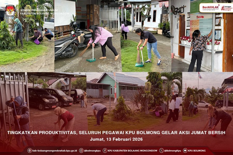 Bolmong - kab-bolaangmongondow.kpu.go.id - Dalam rangka menciptakan lingkungan kerja yang sehat, nyaman, dan asri, segenap jajaran pegawai KPU Kabupaten Bolaang Mongondow melaksanakan kegiatan kerja bakti "Jumat Bersih" di seluruh area perkantoran pada Jumat pagi (13/02).