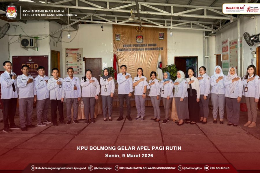 Bolmong, Kab-bolaangmongondow.kpu.id - Seluruh jajaran pegawai Komisi Pemilihan Umum (KPU) Kabupaten Bolaang Mongondow kembali memperkuat komitmen etos kerja melalui pelaksanaan apel pagi rutin yang digelar di halaman kantor pada Senin (09/03/2026).