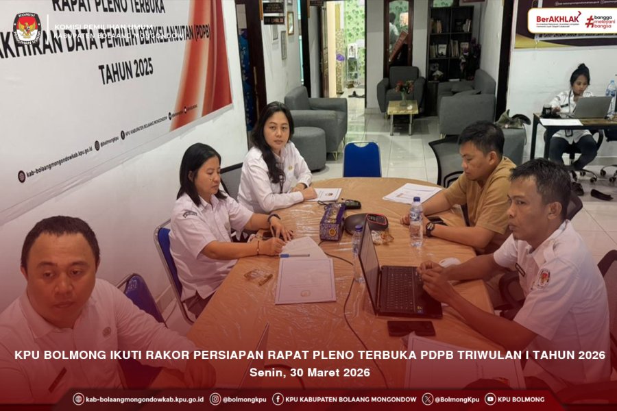 Bolmong, http://kab-bolaangmongondow.kpu.go.id - Dalam rangka memastikan kelancaran Pelaksanaan Rapat Pleno Terbuka Pemutakhiran Data Pemilih Berkelanjutan (PDPB) Triwulan I Tahun 2026, Komisi Pemilihan Umum (KPU) Provinsi Sulawesi Utara melaksanakan Rapat Koordinasi (Rakor) Persiapan Rapat Pleno Terbuka PDPB Triwulan I Tahun 2026. KPU Kabupaten Bolaang Mongondow (Bolmong) mengikuti Rakor tersebut secara daring, yang dipimpin langsung oleh Ketua Divisi Perencanaan, Data dan Informasi KPU Provinsi SULUT, Lanny Ointu. Rapat ini penting dilaksanakan untuk menyelaraskan persepsi, memantapkan kesiapan teknis, serta memastikan seluruh tahapan pelaksanaan Rapat Pleno PDPB berjalan dengan baik.