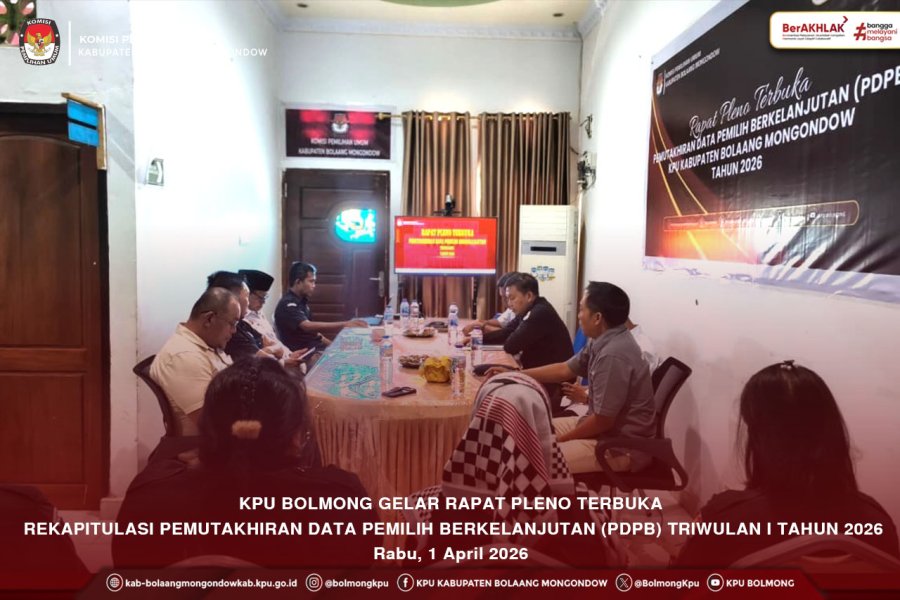 Bolmong, Kab-bolaangmongondow.kpu.id - Komisi Pemilihan Umum (KPU) Kabupaten Bolaang Mongondow (Bolmong) melaksanakan Rapat Pleno Terbuka Rekapitulasi Pemutakhiran Data Pemilih Berkelanjutan (PDPB) Triwulan I Tahun 2026 yang dilaksanakan pada Rabu (01/04/2026) di Kantor KPU Bolmong.