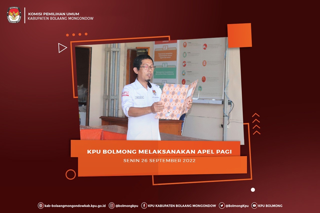Di hadapan peserta Apel, beliau mengapresiasi komitmen jajaran KPU Bolmong untuk mengikuti apel pagi setiap awal minggu berjalan, hal ini merupakan bentuk kesiapan dan sikap tanggung jawab dalam melaksanakan tugas pekerjaan sepanjang minggu berjalan. Di akhir arahanya, beliau kembali mengingatkan terkait pentingnya menjaga kesehatan baik fisik maupun mental karena melakukan aktivitas kerja dengan kondisi jasmani dan rohani yang sehat tentu akan meningkatkan kualitas kinerja masing-masing pegawai khususnya dalam menjalankan tahapan Pemilu 2024 yang semakin padat.