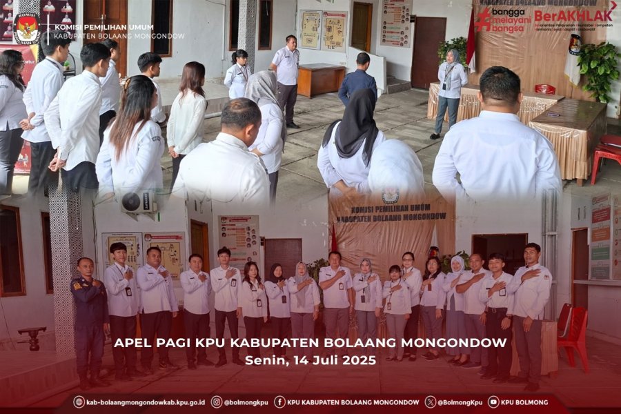 Lolak, kab-bolaangmongondow.kpu.go.id - Senin (14/7/2025) Komisi Pemilihan Umum (KPU) Kabupaten Bolaang Mongondow (Bolmong) kembali melaksanakan Apel Pagi Rutin di halaman kantor. Berkesempatan menjadi pembina Apel, Sekretaris KPU Bolmong, Ratuganesty Mokoginta. Apel yang diikuti oleh jajaran sekretariat ini berlangsung tertib dan lancar.