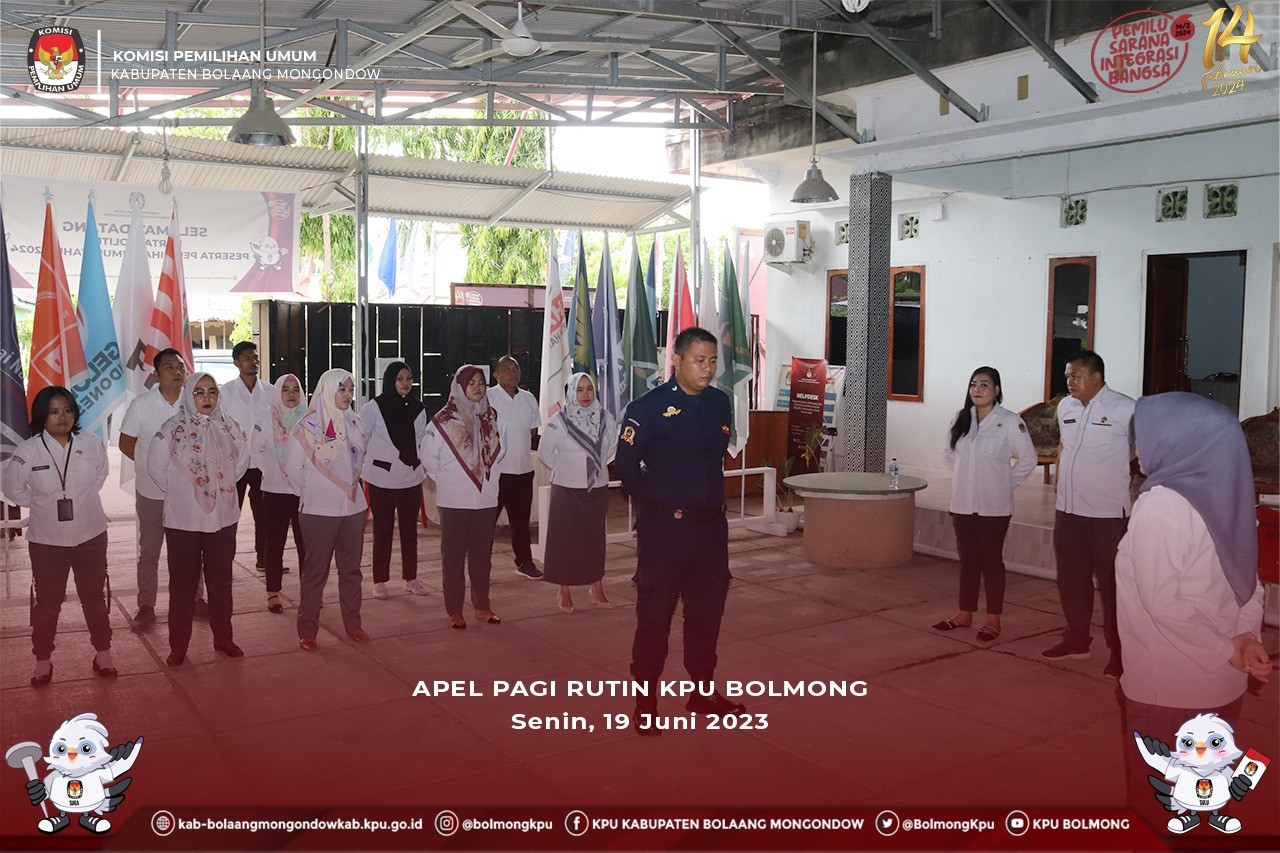 Lolak, kab.bolaangmongondow.kpu.go.id - Plt. Sekretaris KPU Kabupaten Bolaang Mongondow menjadi Pembina dalam Apel Pagi yang secara rutin digelar, Senin (19/6). Dalam arahannya, beliau menghimbau kepada semua jajaran sekretariat untuk semakin meningkatkan kedisiplinan, khususnya terkait kehadiran mengingat dalam minggu berjalan ada beberapa agenda tahapan Pemilu yang akan dilaksanakan. Beliau juga mengingatkan terkait pentingnya menjaga kebersihan lingkungan kantor, hal ini bukan saja menjadi tanggung jawab penuh dari Pramubakti, tetapi diperlukan kesadaran dari masing-masing pegawai, karena lingkungan kerja yang bersih dapat memberi pengaruh positif bagi kinerja dan produktivitas melaksanakan tahapan Pemilu.