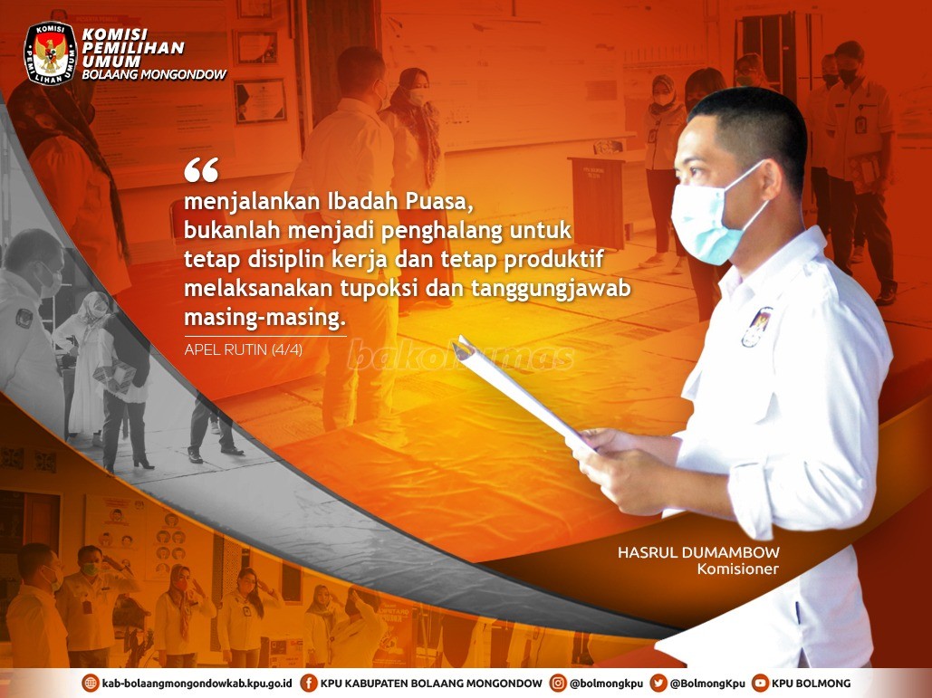 Lolak, kab-bolaangmongondow.kpu.go.id - Mengawali agenda kerja di bulan April, pejabat dan pegawai di Lingkungan Komisi Pemilihan Umum Kabupaten Bolaang Mongondow melaksanakan Apel Pagi Rutin pada Senin (4/4). Berkesempatan menjadi Pembina Apel, Anggota KPU Divisi Sosialisasi, Pendidikan Pemilih, Partisipasi Masyarakat dan SDM, Hasrul Dumambow.
