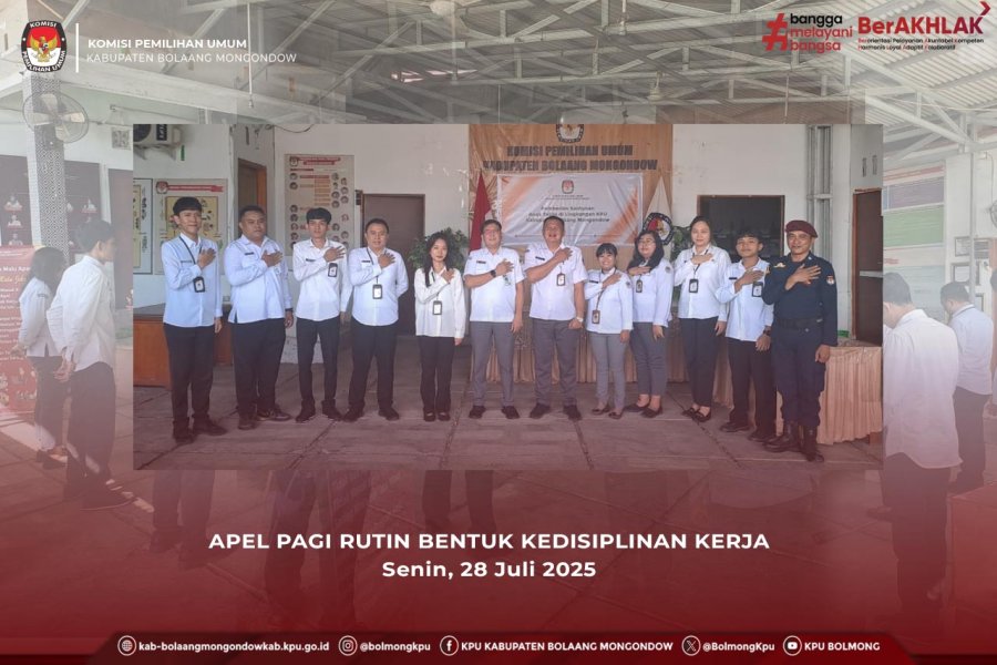 Lolak, kab-bolaangmongondow.kpu.go.id - Mengawali aktifitas kerja pada minggu terakhir bulan Juli, KPU Kabupaten Bolaang Mongondow (Bolmong) melaksanakan Apel Pagi. Bertindak sebagai Pembina Apel, Kasubag Keuangan, Umum dan Logistik, Meydi Wolah.