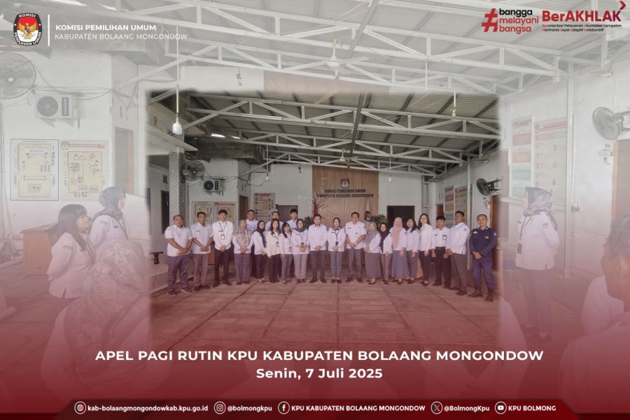 Lolak, kab-bolaangmongondow.kpu.go.id - Apel Pagi kembali dilaksanakan pada Senin, 7 Juli 2025 yang diikuti oleh komisioner dan jajaran sekretariat KPU Kabupaten Bolaang Mongondow dan yang berkesempatan menjadi Pembina Apel, Ketua Divisi Perencanaan, Data dan Informasi, Jalaludin Koesasi.
