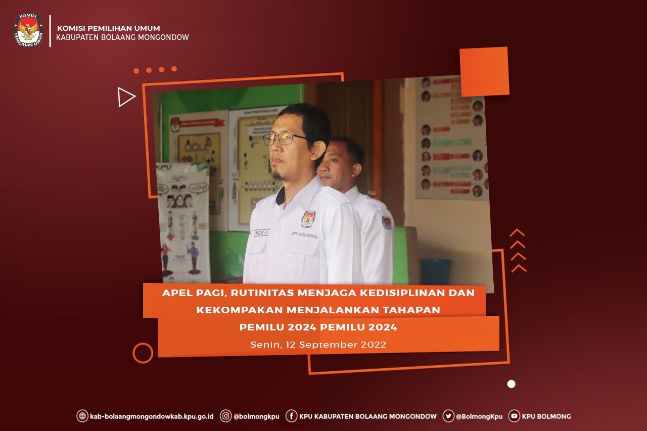Lolak, kab-bolaangmongondow.kpu.go.id - Apel Pagi merupakan rutinitas yang wajib diikuti oleh seluruh pejabat dan pegawai di lingkungan KPU Kabupaten Bolaang Mongondow di setiap awal minggu berjalan. Kali ini Senin (12/9), berkesempatan menjadi Pembina Apel, Ketua Divisi Hukum dan Pengawasan, Ingga S. Adampe.