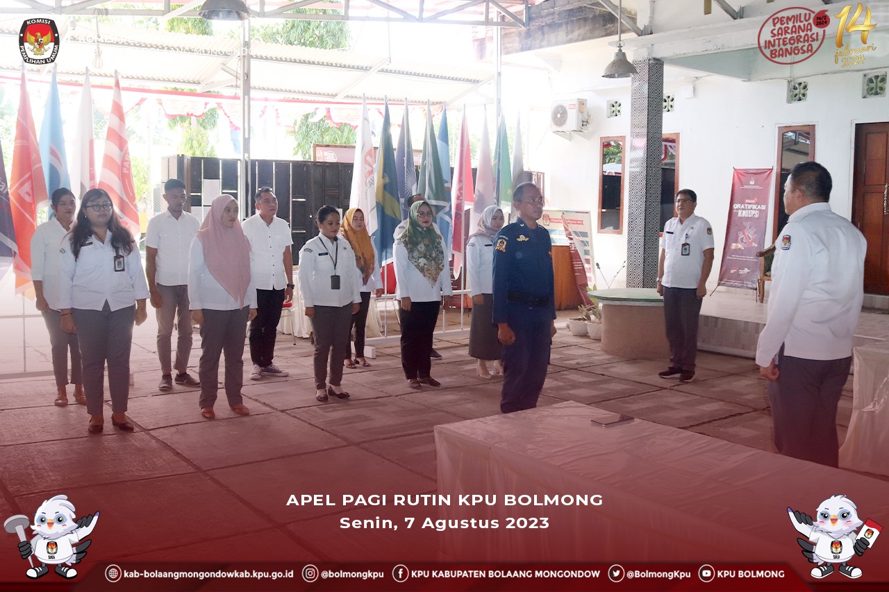 Lolak, kab.bolaangmongondow.kpu.go.id – Komisi Pemilihan Umum (KPU) Kabupaten Bolaang Mongondow (Bolmong) kembali melaksanakan Apel Pagi Rutin, Senin (7/8). Berkesempatan menjadi Pembina Apel, Meydi Wolah, selaku Kepala Sub Bagian Keuangan, Umum, dan Logistik.