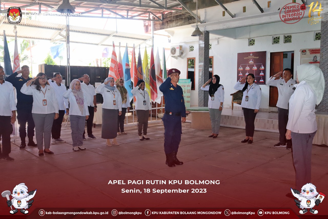 Lolak, kab.bolaangmongondow.kpu.go.id – Senin, 18 September 2023 Komisi Pemilihan Umum (KPU) Kabupaten Bolaang Mongondow (Bolmong) kembali melaksanakan Apel pagi rutin di kantor, dengan pembina Apel Sekretaris KPU Bolmong, Ratuganesty Mokoginta.