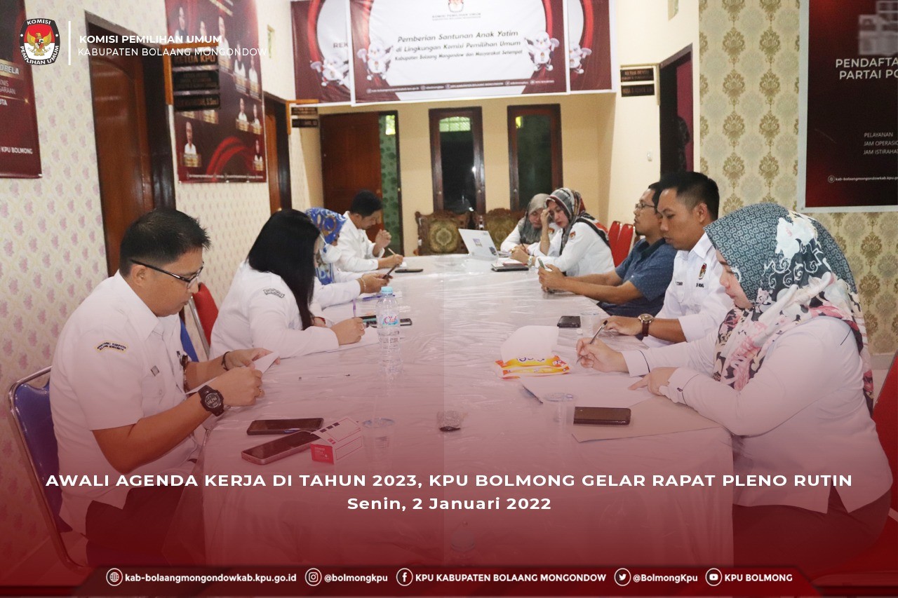 Lolak, kab-bolaangmongondow.kpu.go.id - Awali agenda kerja tahun 2023, KPU Kabupaten Bolaang Mongondow gelar Rapat Pleno Rutin (2/1). Kegiatan yang merupakan agenda rutin setiap minggunya ini bertujuan melaksanakan evaluasi terhadap hasil rapat pleno di minggu sebelumnya serta membahas agenda-agenda kerja yang akan dilaksanakan pada selang minggu pertama bulan Januari.