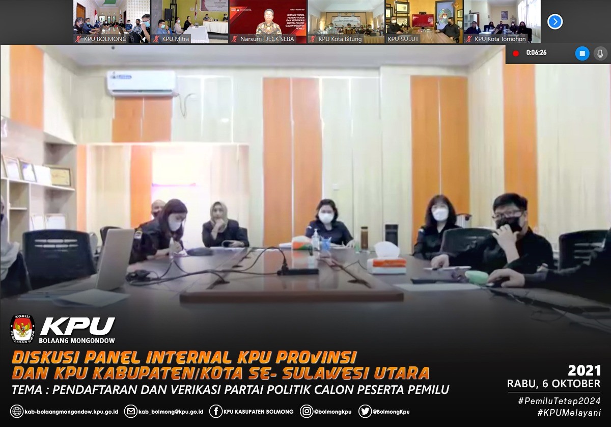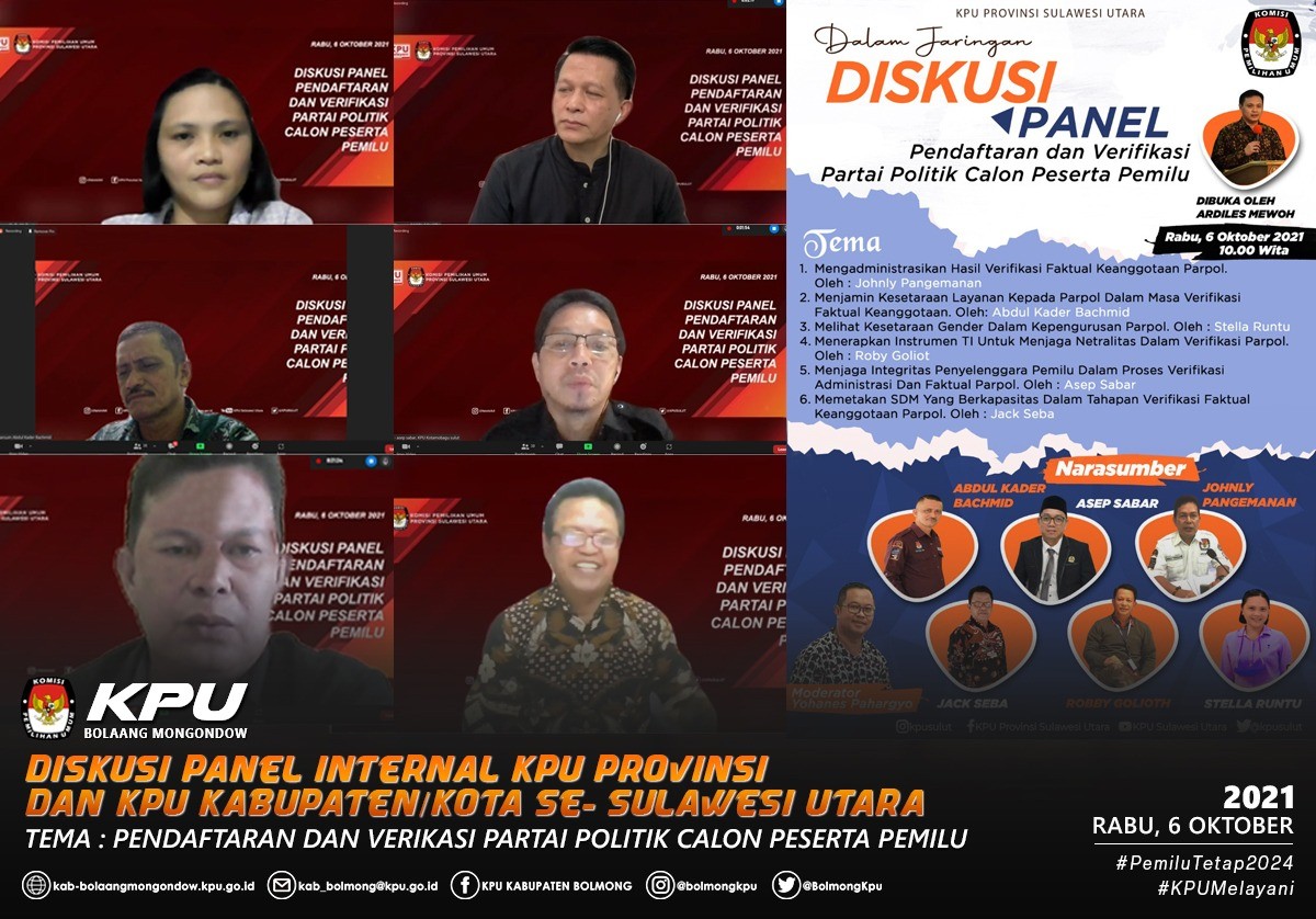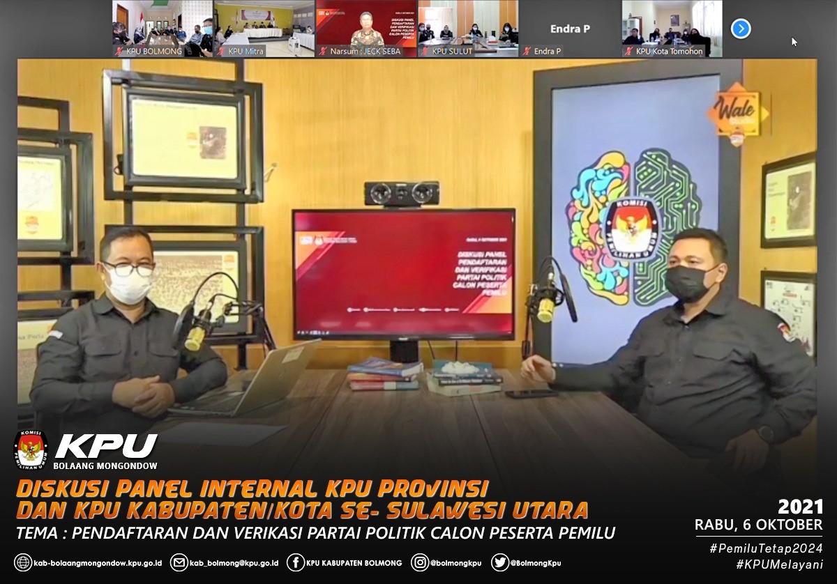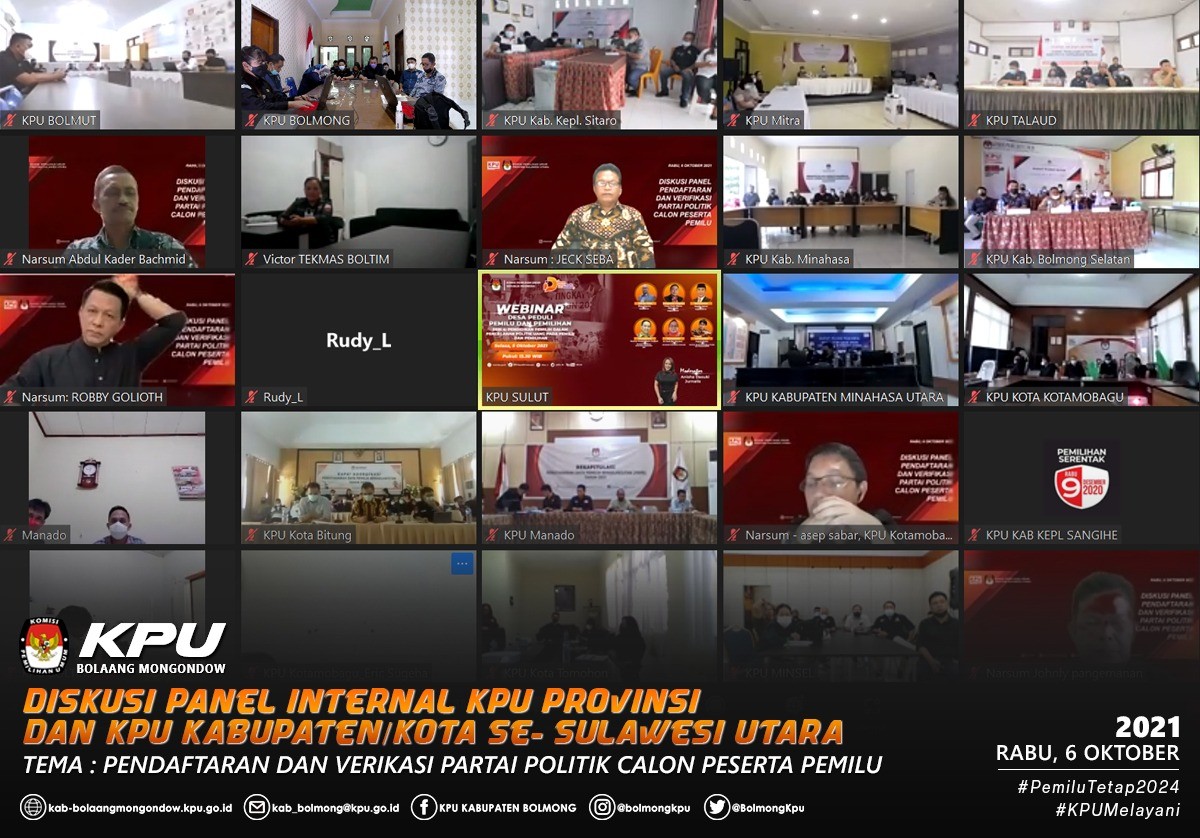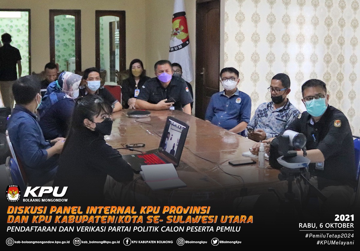 “Diskusi ini menjadi sangat penting bagi kita semua karena merupakan bagian dari konsolidasi dalam rangka persiapan menuju 2024”, ujar Ketua KPU Sulut, Ardiles M.R. Mewoh saat membuka kegiatan Diskusi Panel Internal KPU Provinsi dan KPU Kabupaten/Kota se- Sulawesi Utara bertajuk “Pendaftaran dan Verifikasi Partai Politik Calon Peserta Pemilu” yang dilaksanakan secara daring pada, Rabu (6/10) dan turut dihadiri oleh para Komisioner, Sekretaris, Kepala Bagian Hukum, Teknis dan Hupmas, Kepala Sub Bagian dan Staf Pelaksana Teknis dan Hupmas KPU Provinsi Sulawesi Utara. Sedangkan dari KPU Kabupaten Bolaang Mongondow diikuti oleh Ketua, Anggota, Sekretaris, para Kepala Sub Bagian dan jajaran.