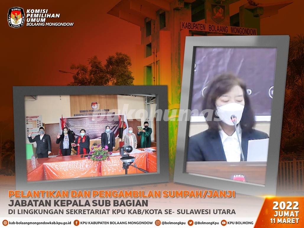 Lolak, kab-bolaangmongondow.kpu.go.id - Sebanyak 66 (enam puluh enam) orang Pejabat Pengawas atau Kepala Sub Bagian di Lingkungan Sekretariat KPU Provinsi Sulawesi Utara dan Sekretariat KPU di 15 Kabupaten/Kota resmi dilantik oleh Sekretaris Jenderal KPU Republik Indonesia, Bernard Dermawan Sutrisno melalui Sekretaris KPU Provinsi Sulawesi Utara, Pujiastuti. Pelantikan dan Pengambilan Sumpah/Janji yang digelar serentak di seluruh Lingkungan Sekretariat KPU se-Indonesia ini dilaksanakan berdasarkan Keputusan Sekretaris Jenderal KPU RI Nomor 254 Tahun 2022.