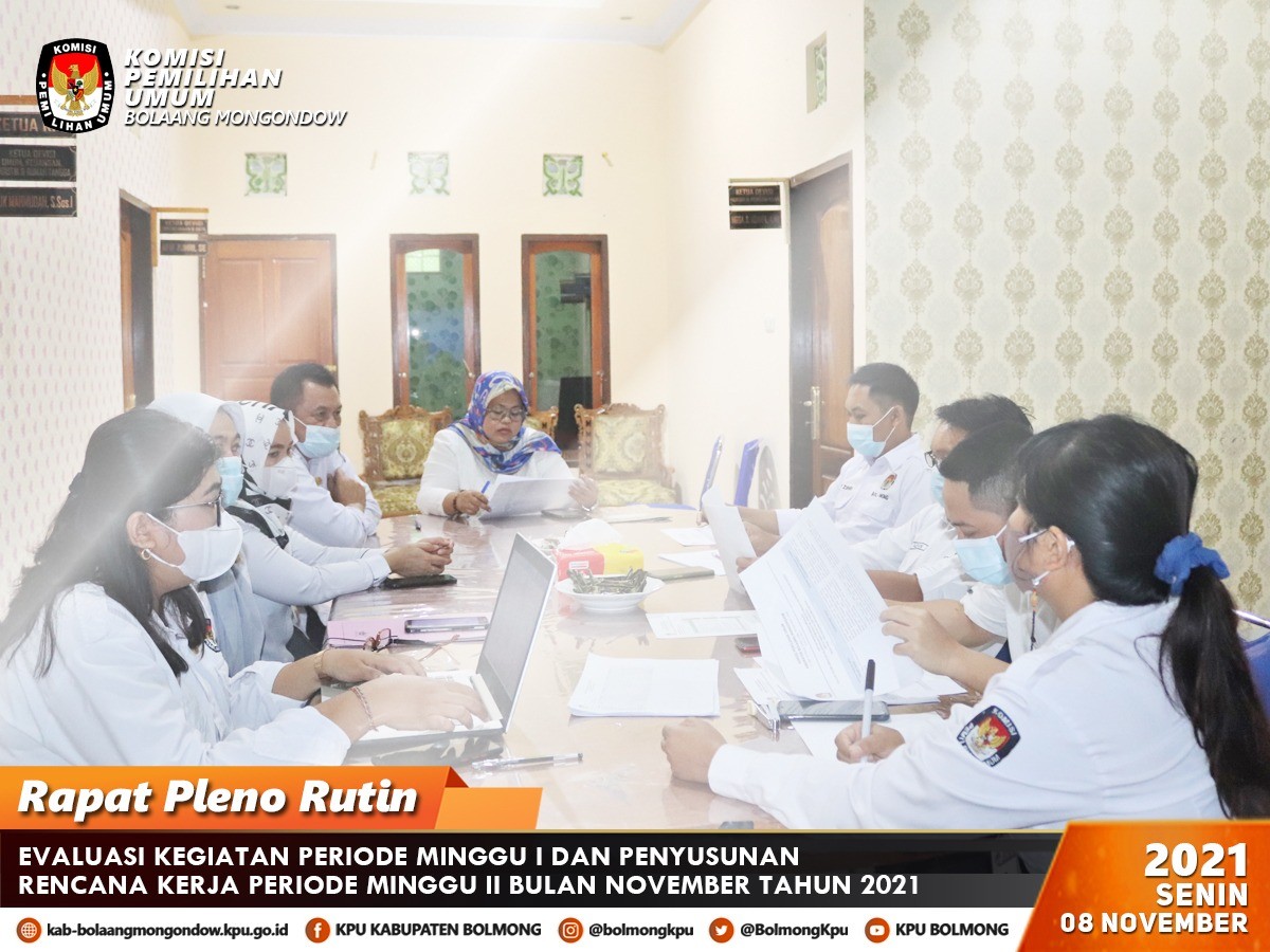 Lolak - Dalam rangka pengambilan kebijakan rutin berdasarkan Pasal 60 Peraturan Komisi Pemilihan Umum Nomor 8 Tahun 2019 tentang Tata Kerja Komisi Pemilihan Umum, Komisi Pemilihan Umum Provinsi, dan Komisi Pemilihan Umum Kabupaten/Kota sebagaimana telah diubah dengan Peraturan Komisi Pemilihan Umum Nomor 4 Tahun 2021 tentang Perubahan Ketiga Atas Peraturan Komisi Pemilihan Umum Nomor 8 Tahun 2019 tentang Tata Kerja Komisi Pemilihan Umum, Komisi Pemilihan Umum Provinsi, dan Komisi Pemilihan Umum Kabupaten/Kota, maka KPU Kabupaten Bolaang Mongondow kembali mengelar Rapat Pleno Rutin pada, Senin (8/11).