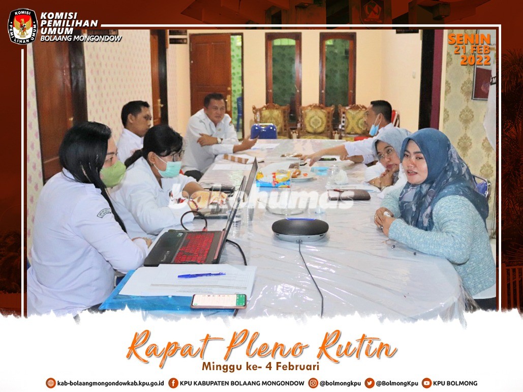Kegiatan ini diawali dengan reviu dan dan evaluasi terhadap pelaksanaan hasil rapat pleno minggu III Februari dan dilanjutkan dengan pembahasan dan penetapan rencana kerja yang akan dilaksanakan pada selang minggu IV Februari yang telah disusun oleh masing-masing sub bagian, sebagaimana tertuang dalam lampiran Berita Acara Rapat Pleno Rutin KPU Kabupaten Bolaang Mongondow Nomor 20/PK.01/7101/2022 tanggal 21 Februari 2022.