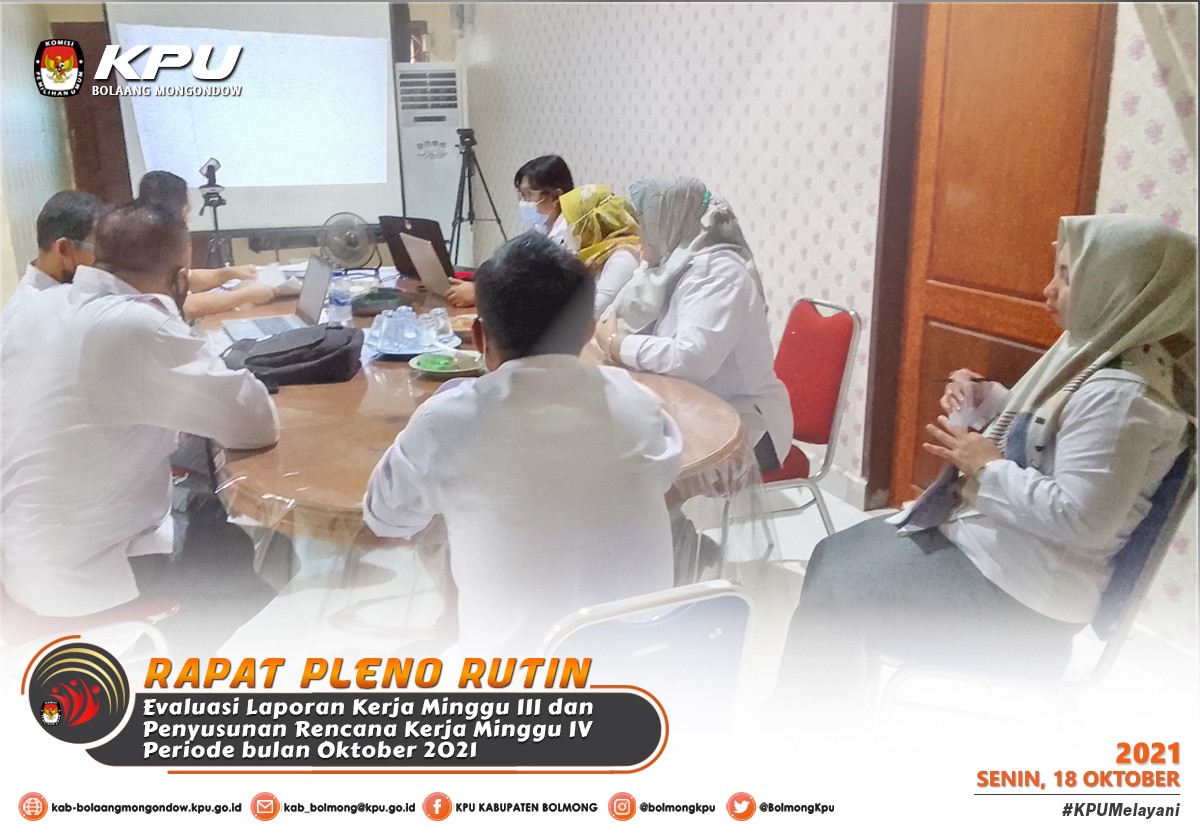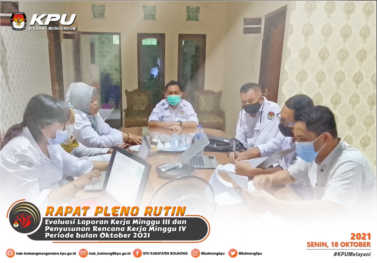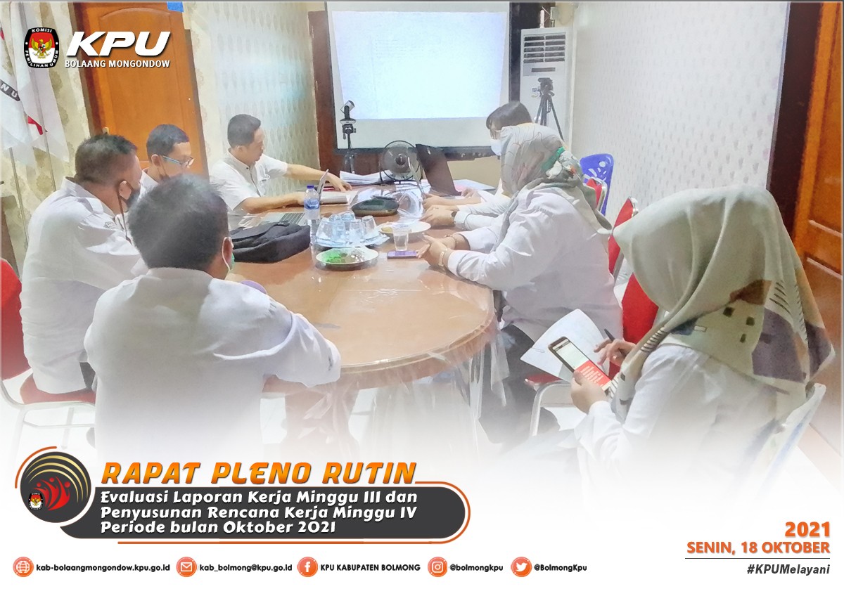 Lolak - Berdasarkan Peraturan KPU Nomor 4 Tahun 2021 tentang Perubahan Ketiga Atas Peraturan KPU Nomor 8 Tahun 2019 tentang Tata Kerja Komisi Pemilihan Umum, Komisi Pemilihan Umum Provinsi, dan Komisi Pemilihan Umum Kabupaten/Kota, maka pada Senin (18/10) KPU Kabupaten Bolaang Mongondow melaksanakan Rapat Pleno Rutin minggu IV Oktober, sebagaimana surat undangan Ketua KPU Kabupaten Bolaang Mongondow Nomor 202/PK.01/7101/2021 yang dilaksanakan secara luring.