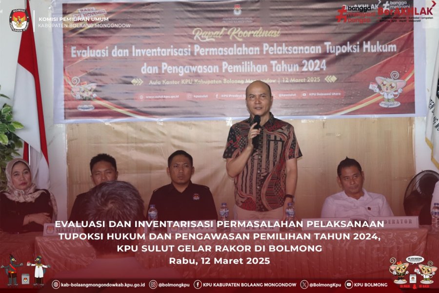 Lolak, kab-bolaangmongondow.kpu.go.id, rangkaian kegiatan Rapat Koordinasi Evaluasi dan Inventarisasi Permasalahan Pelaksanaan Tupoksi Hukum dan Pengawasan Pemilihan Tahun 2024 terus digelar oleh KPU Provinsi Sulawesi Utara (Sulut). Kali ini pada Rabu 12 Maret 2025 dilaksanakan di wilayah Bolaang Mongondow, tepatnya di kantor KPU Kabupaten Bolaang Mongondow (Bolmong).