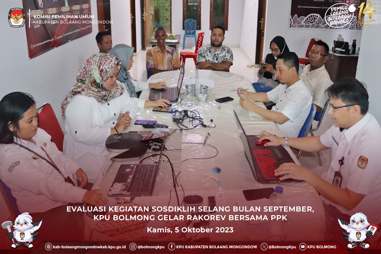 Lolak, kab.bolaangmongondow.kpu.go.id – dalam rangka mengevaluasi pelaksanaan sosialisasi dan pendidikan Pemilih oleh Badan Adhoc, Komisi Pemilihan Umum (KPU) Kabupaten Bolaang Mongondow (Bolmong) secara rutin melaksanakan rapat koordinasi dan evaluasi setiap bulannya. Untuk periode bulan September 2023 dilaksanakan secara luring dan daring dengan mengundang Ketua PPK, Anggota PPK Divisi Sosialisasi, Pendidikan Pemilih, Parmas dan SDM, serta Admin media sosial resmi PPK.