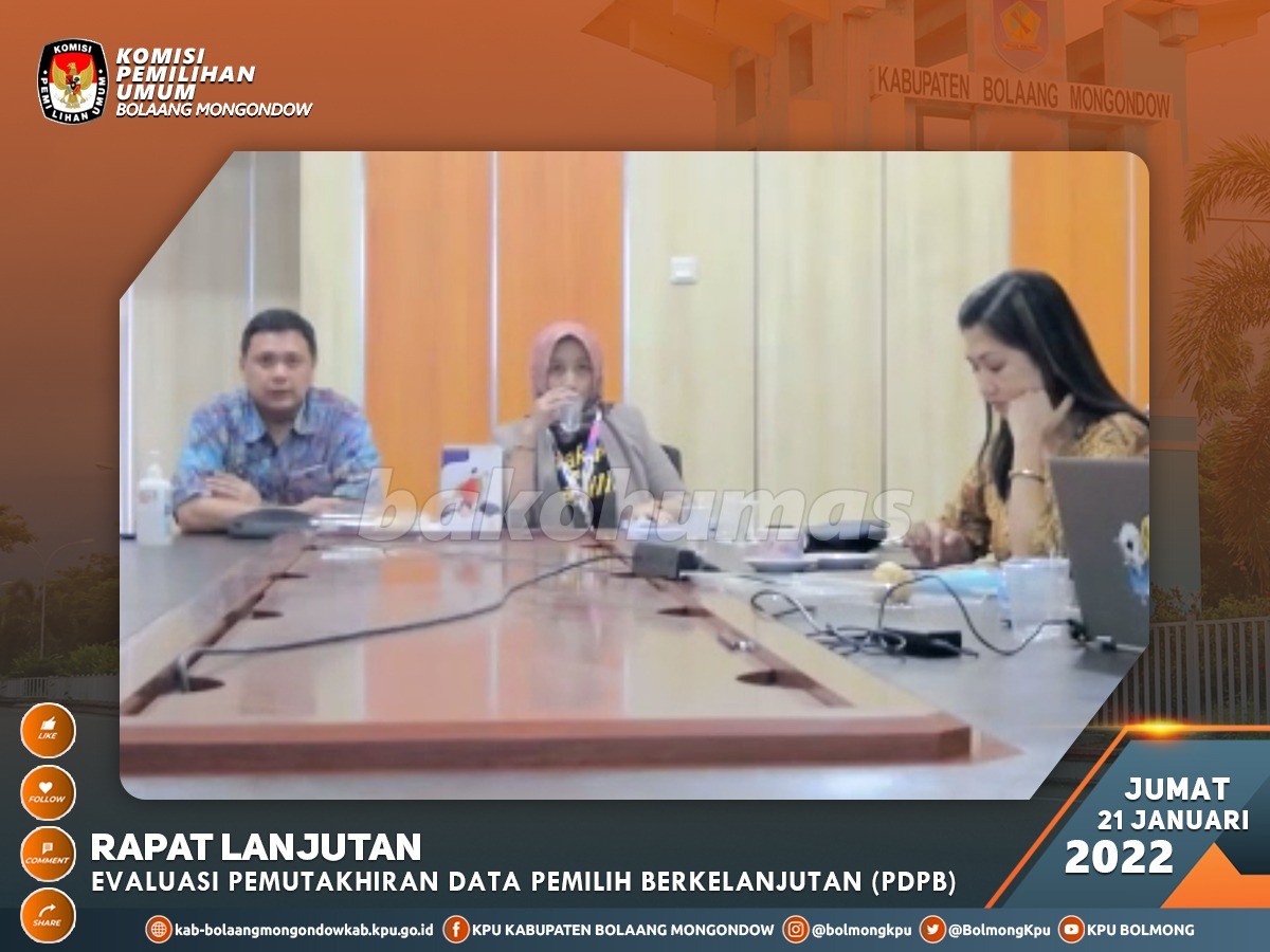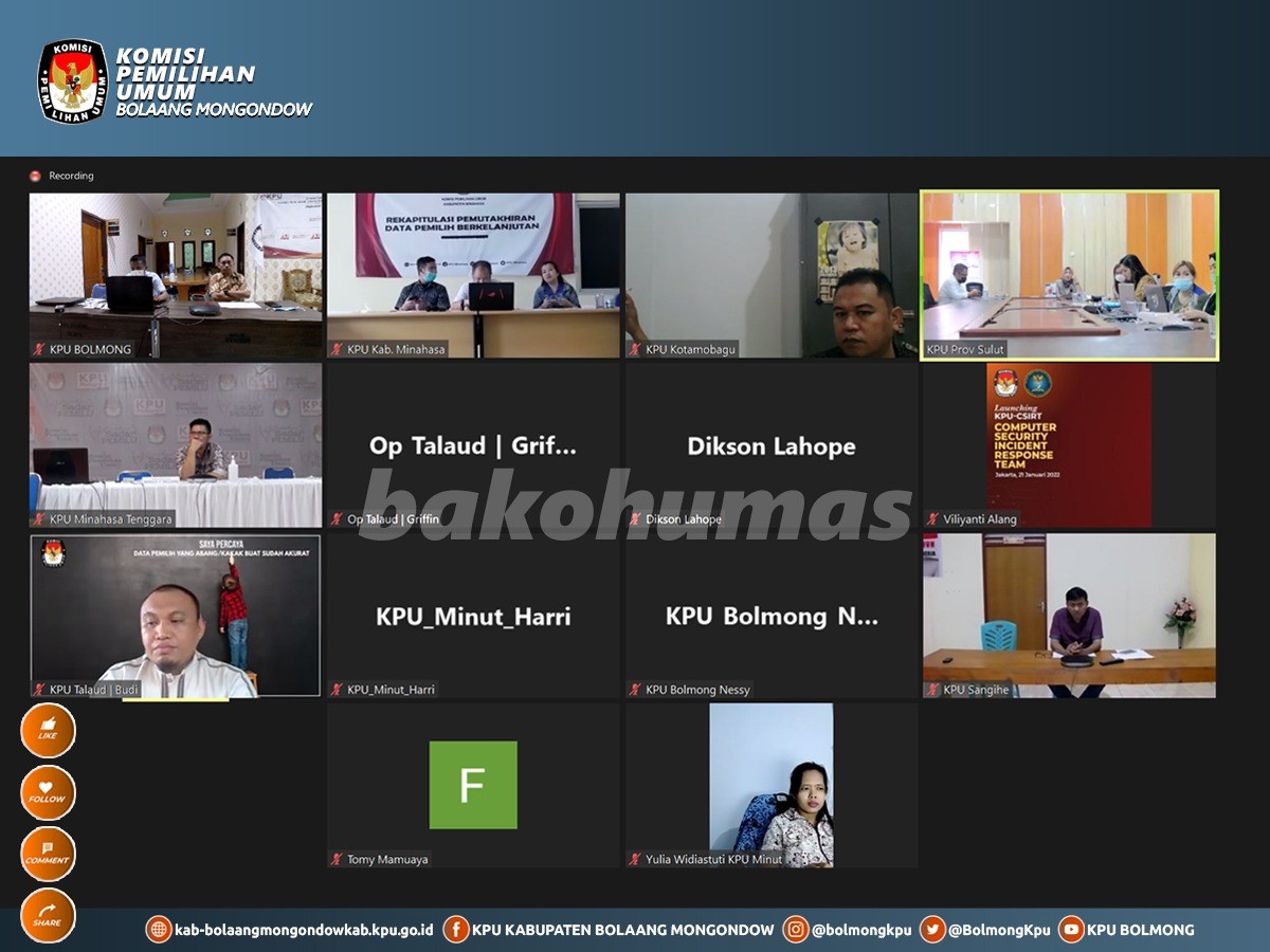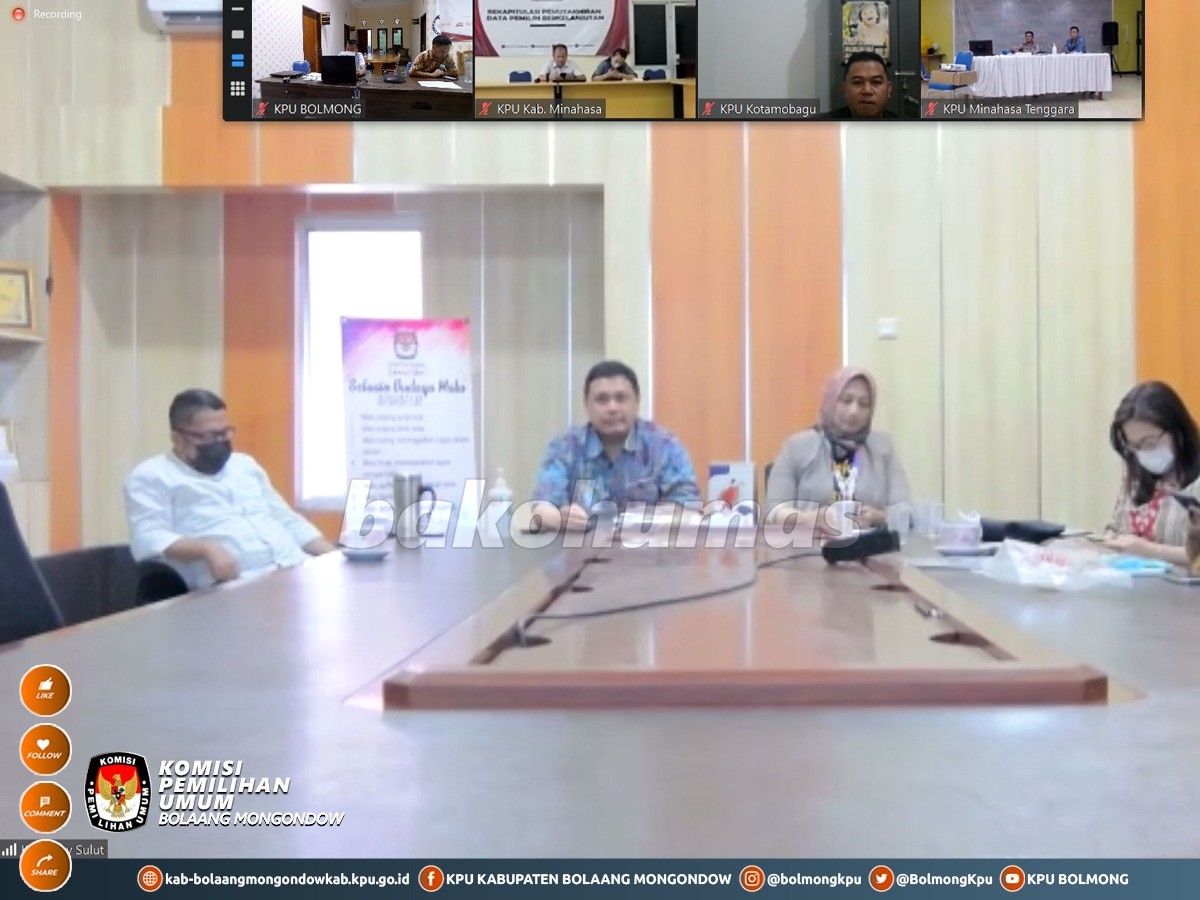 Lolak, Bolmong, kab-bolaangmongondow.kpu.go.id - Jumat (21/01), KPU Provinsi Sulawesi Utara mengadakan Rapat Lanjutan Evaluasi Pemutakhiran Data Pemilih Berkelanjutan (PDPB) secara daring yang diikuti oleh 7 KPU Kabupaten/Kota termasuk KPU Kabupaten Bolaang Mongondow, setelah sebelumnya 8 KPU Kabupaten/Kota mengikuti kegiatan ini pada hari Rabu (19/01).