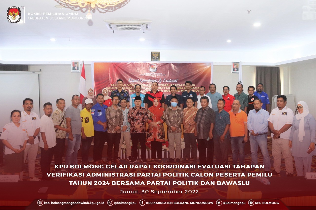 Lolak, kab-bolaangmongondow.kpu.go.id - Jumat, (30/9) KPU Kabupaten Bolaang Mongondow melaksanakan Rapat Koordinasi Evaluasi Tahapan Verifikasi Administrasi Partai Politik Calon Peserta Pemilu Tahun 2024 bersama Partai Politik tingkat Kabupaten Bolaang Mongondow dan Bawaslu Kabupaten Bolaang Mongondow.