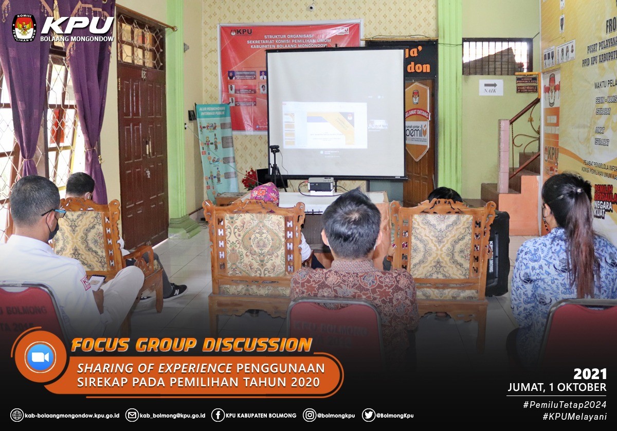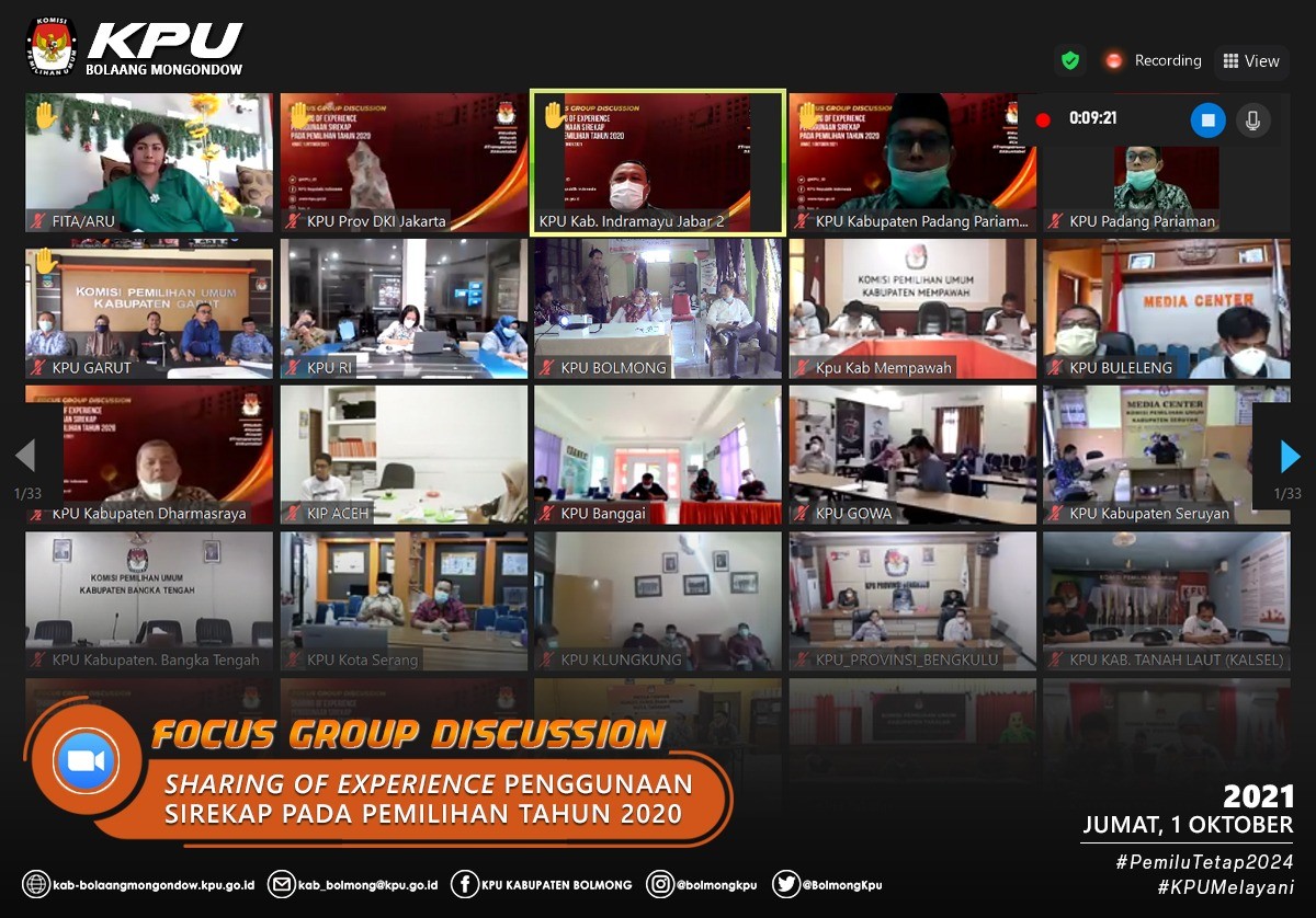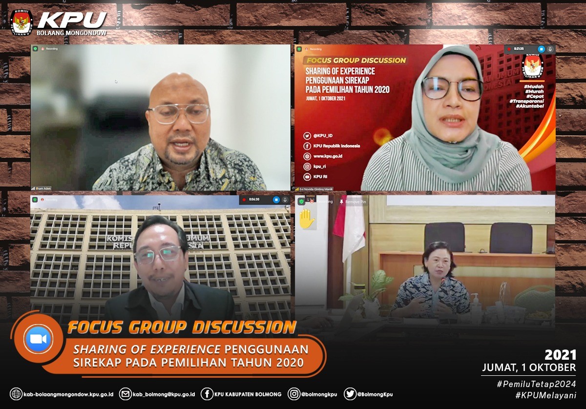Lolak - Komisi Pemilihan Umum terus berupaya melakukan evaluasi terhadap aplikasi Sirekap (Sistem Informasi Rekapitulasi) yang pertama kalinya digunakan pada Pemilihan Serentak tahun 2020 silam, salah satunya dengan melaksanakan Focus Group Discussion (FGD) Sharing of Experience Penggunaan Aplikasi Sirekap pada Pemilihan secara daring dengan mengundang KPU Provinsi dan KPU Kabupaten/Kota se- Indonesia pada, Jumat (1/10/2021).