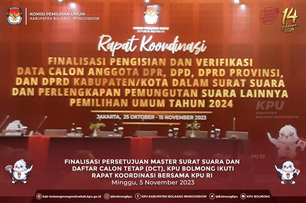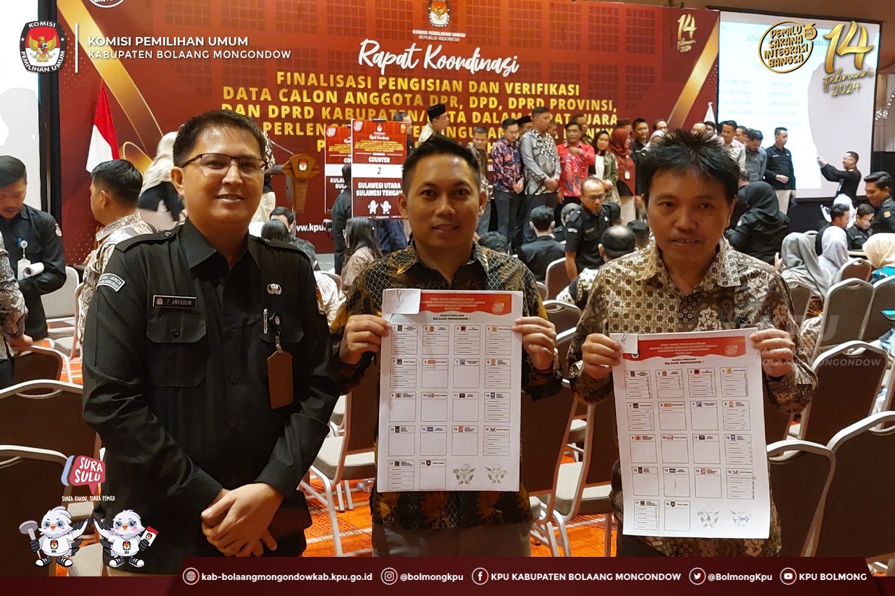 Lolak, kab-bolaangmongondow.kpu.go.id - KPU Kabupaten Bolaang Mongondow (Bolmong) mengikuti Rapat Koordinasi Finalisasi Pengisian dan Verifikasi Data Calon Anggota DPR, DPD, DPRD Provinsi, dan DPRD Kabupaten/Kota dalam Surat Suara dan Perlengkapan Pemungutan Suara Lainnya, dalam rangka Finalisasi Persetujuan Master Surat Suara dan Daftar Calon Tetap (DCT) oleh KPU Provinsi dan KPU Kabupaten/Kota.